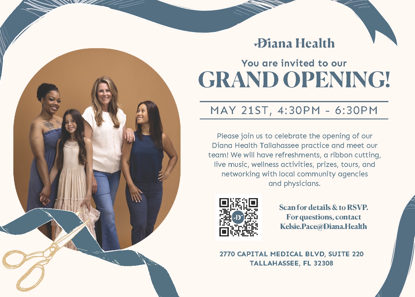 Join us in celebrating the grand opening of Diana Health’s new Tallahassee practice! This special event will feature a ribbon cutting, refreshments, live music, wellness activities, prizes, office tours, and networking with local community agencies and physicians. It’s a wonderful opportunity to meet the Diana Health team and learn more about their mission to deliver compassionate, personalized healthcare.