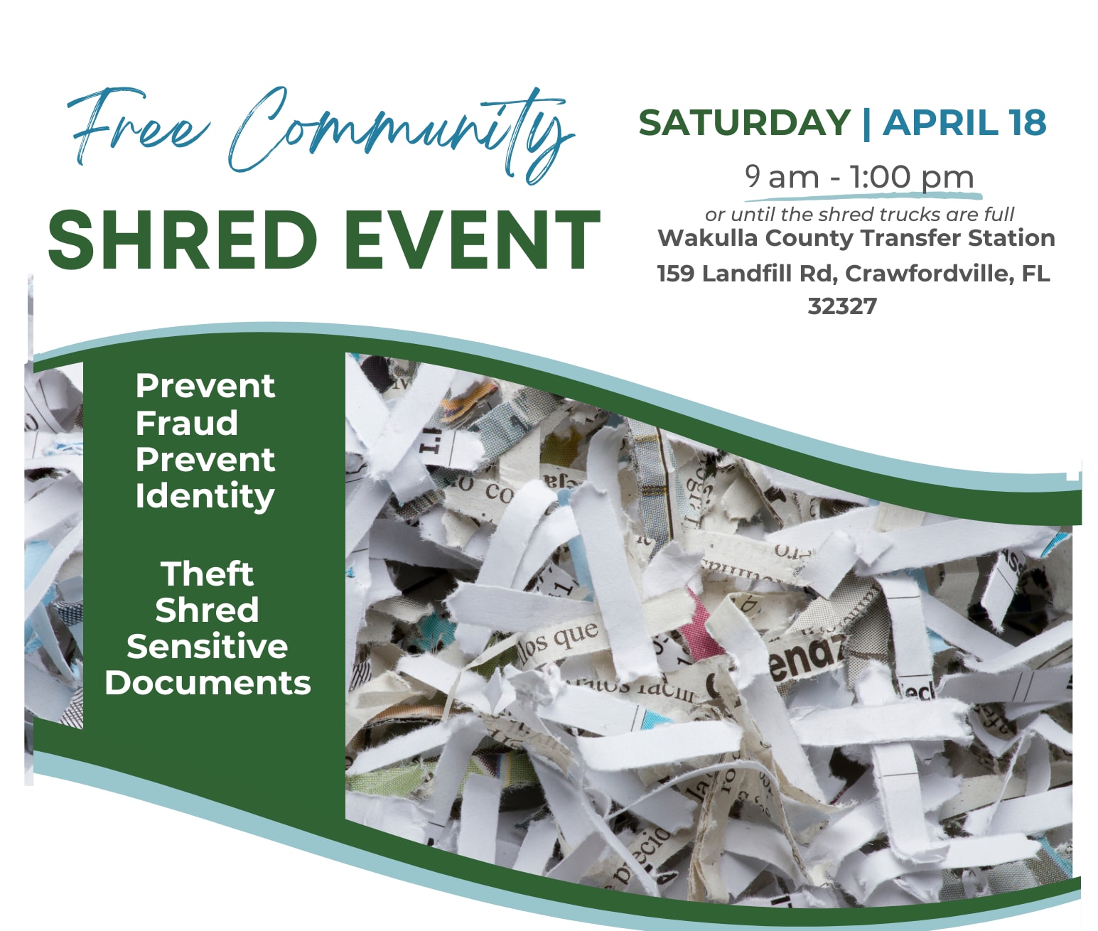 This event provides residents with a safe and secure way to dispose of sensitive documents and help prevent fraud and identity theft. All shredding will be done on-site by Secure Records Solutions. Important Guidelines: • Items must be in the trunk or rear of your vehicle • No need to remove staples, paperclips, or file folders • No binders, metal, or plastic items (including CDs, floppy disks, Ziplock bags, or credit cards) For questions about accepted items, please contact Secure Records Solutions at (850) 656-6900 or visit www.securerecordssolutions.com/shred-day-faq Thank you to our event partners and sponsors: Wakulla County, Waste Pro, English Financial Group, Secure Records Solutions, Wakulla County Sheriff’s Office, and the Wakulla County Chamber of Commerce. This is a free community service event; we encourage everyone to take advantage of this opportunity to protect their personal information.