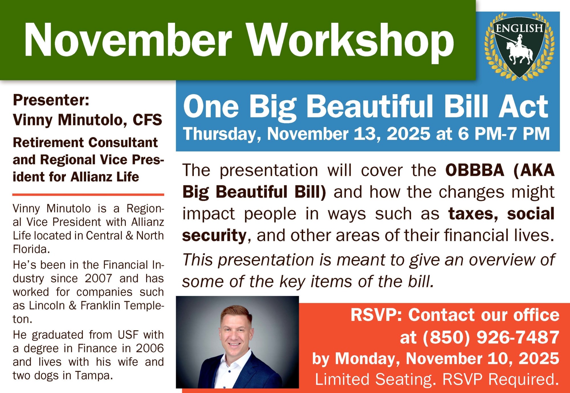 The presentation will cover the OBBBA (AKA Big Beautiful Bill) and how the changes might impact people in ways such as taxes, social security, and other areas of their financial lives.