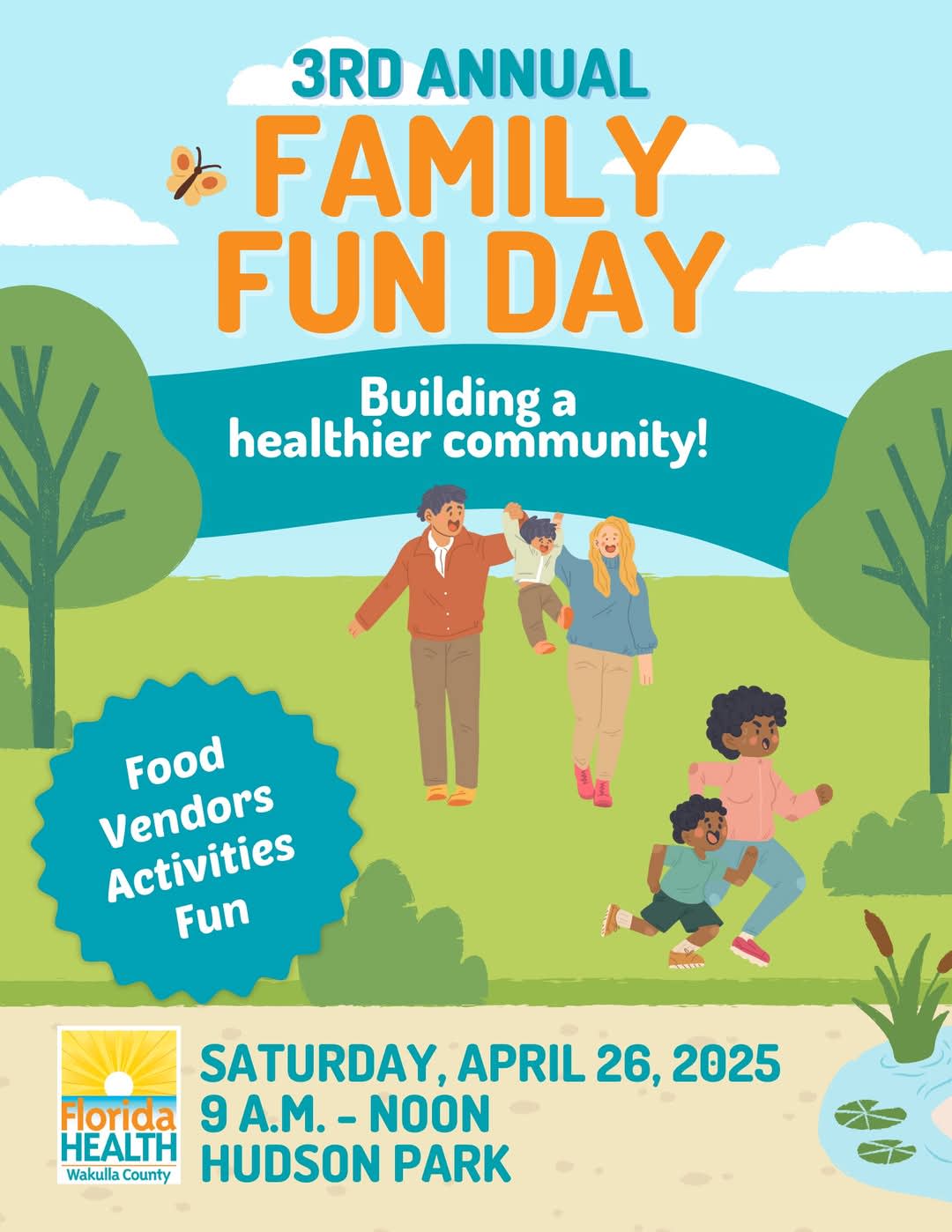 Join us Saturday April 26th from 9:00 am to Noon at Hudson Park for a day full of family fun! There will be food, games, music and all the fun! For any questions about this event or if you would like to become a vendor reach out to Kayleen Pafford at 850-888-6078 or email at kayleen.pafford@flhealth.gov.Images