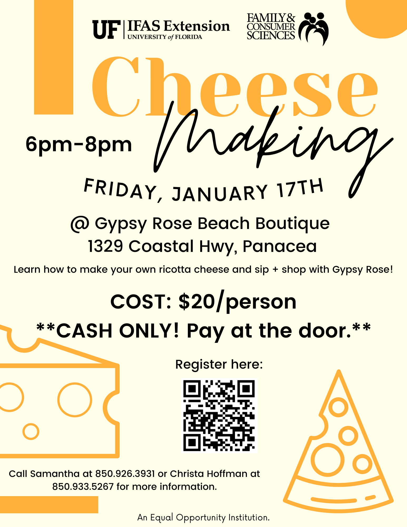 We will have a host from UF IFAS Extension join us to teach us how to make ricotta. Enjoy 15% off in store purchases and free wine to sip on !! This class will fill up fast so please sign up as soon as you can. Pay in cash day of event 🪩https://www.facebook.com/share/182f1om3Cp/?mibextid=wwXIfr