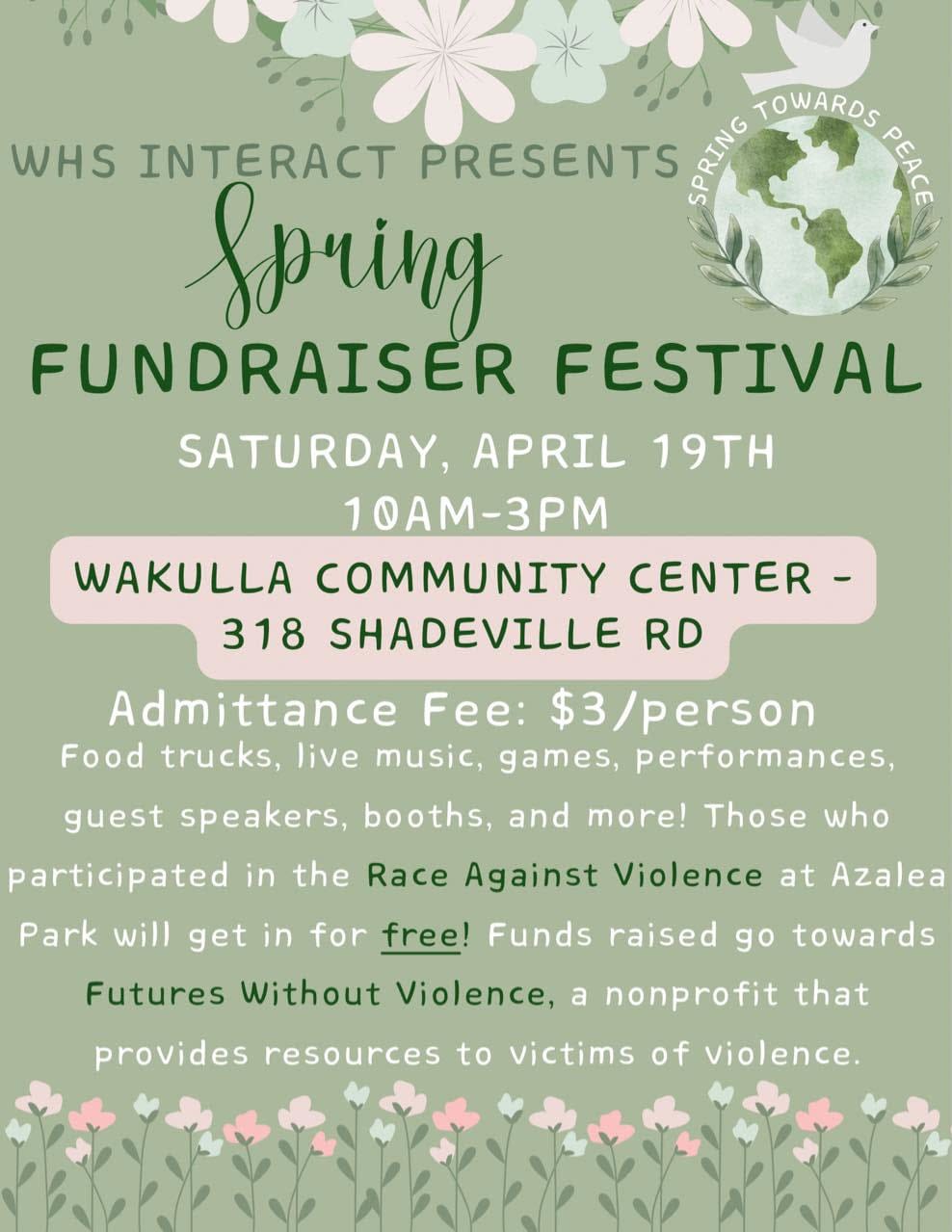Hosted by WHS Interact Club 📍 Wakulla Community Center – 318 Shadeville Rd Join the WHS Interact Club for a day of community, awareness, and action as we come together to support Futures Without Violence, a nonprofit dedicated to providing resources to victims of violence. 🏃♀️ Race Against Violence – 5K Walk/Run Saturday, April 19th Walk-up Registration: 8:00 AM Race Start Time: 8:30 AM Entry Fee: $15 (Pay at the registration table – shirt availability is first come, first served) Includes: Water and prizes for 1st, 2nd, and 3rd place finishers Whether you run, walk, or cheer from the sidelines, your participation supports a powerful cause right here in Wakulla County. 🎉 Spring Fundraiser Festival Saturday, April 19th | 10:00 AM – 3:00 PM Admission: $3 per person (Free for race participants!) Enjoy a full day of food trucks, live music, games, performances, guest speakers, vendor booths, and more! This community celebration follows the morning race and is a perfect outing for families, friends, and supporters of youth empowerment and violence prevention. 📩 Questions? Contact: brooke.post@wcsb.us 📷 Follow on Instagram: @wakulla_interactImages