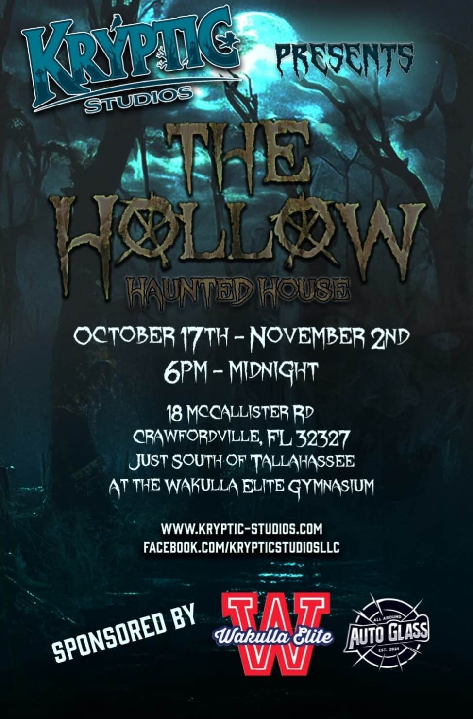 The Hollow Haunted House, a spine-chilling adventure right here in Wakulla County! Step into the darkness and see if you can survive the scares waiting inside. Location: The Wakulla Elite Gymnasium 18 McCallister Rd, Crawfordville, FL 32327 Dates: October 17th – November 2nd Hours: Wednesday & Thursday: 6:00 PM – 11:00 PM Friday – Sunday: 5:00 PM – Midnight Dare to enter The Hollow… if you’re brave enough. 🔗 More info: www.kryptic-studios.com