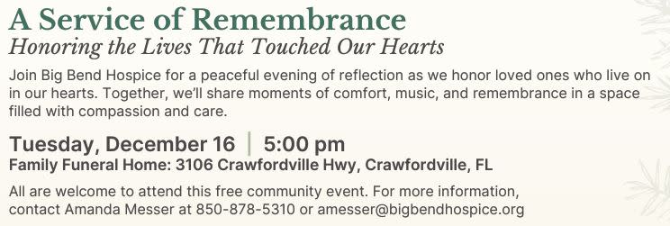 Honoring the Lives That Touched Our Hearts Join Big Bend Hospice for a peaceful evening of reflection as we honor and remember loved ones who continue to live on in our hearts. This meaningful gathering will include moments of comfort, music, and remembrance, all shared in a space filled with compassion and care. This is a free community event, and everyone is welcome. For more information, please contact Amanda Messer at 850-878-5310 or amesser@bigbendhospice.org